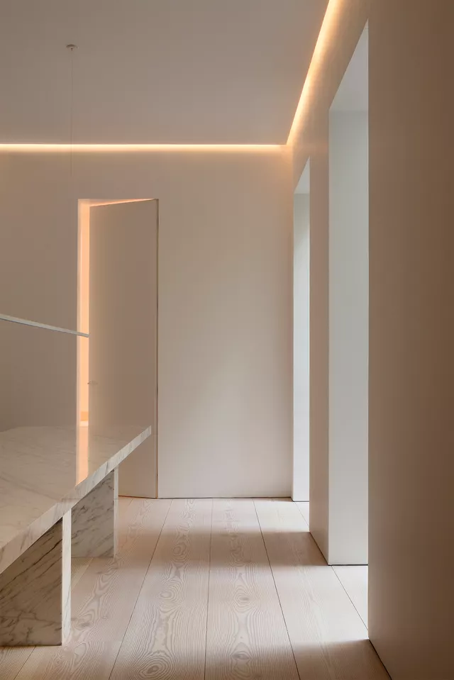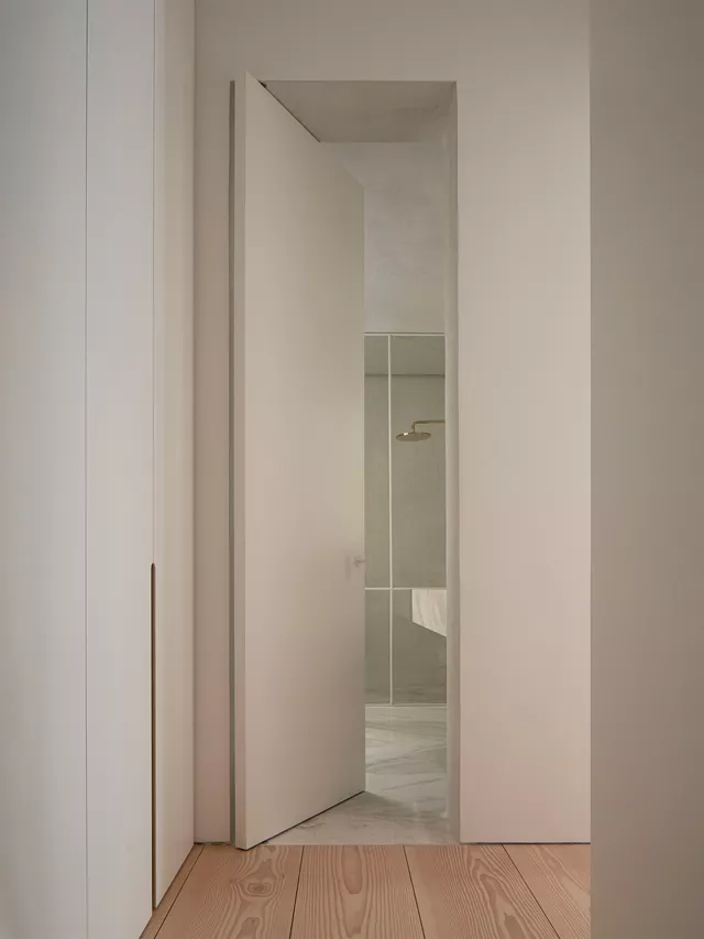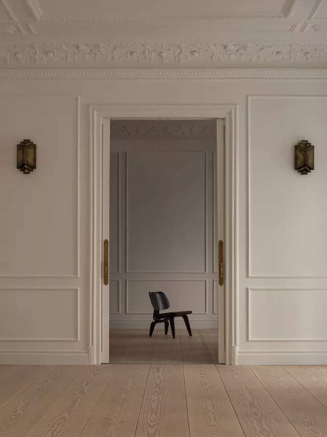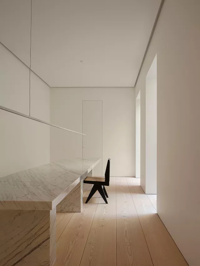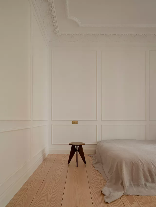 La incorporación de suelos hechos a medida de grandes tablones macizos de abeto gran Douglas, así como de elementos contemporáneos diseñados y fabricados artesanalmente a medida, crean un delicado ambiente atemporal donde lo clásico y lo contemporáneo conviven en armonía.