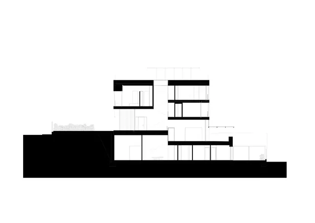 El programa se resuelve eficazmente mediante tres pantallas estructurales paralelas que forman una primera banda infraestructural que agrupa todos los núcleos de comunicación e instalaciones y otra banda estancial limpia de 7 m libres de crujía a la que sirve. El esquema de vivienda se completa adaptando su espacio interior al fuerte desnivel existente entre las dos calles a las que vuelca la parcela, mediante un sistema de losas contrapeadas articuladas a través de un gran espacio central iluminado y ventilado que comunica visualmente las distintas estancias que forman el programa de día, generando espacios limpios, ordenados y de escala monumental.