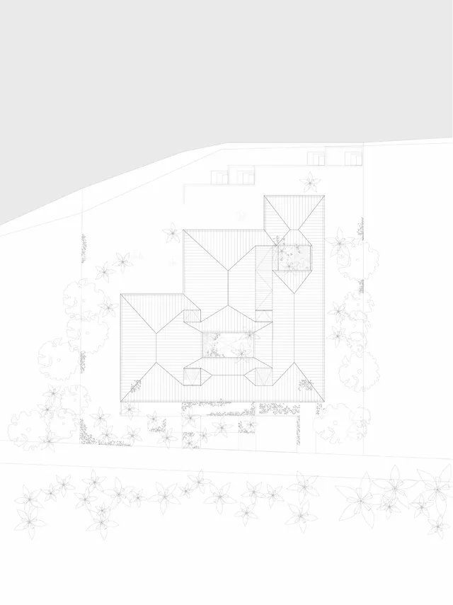 El programa de la casa se organiza a partir de un patio central y su distribuidor perimetral, en torno al cual se construyen 4 piezas rectangulares de diferente escala que albergan las distintas estancias interiores del programa doméstico. Los espacios exteriores se diseñan con el mismo detalle que los interiores con los que comparten tanto la cubierta como el propio plano del suelo.
