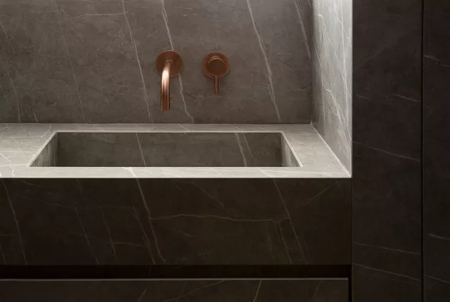 Careful, isolated use of fine materials in furnishing elements designed in black and greenish-grey stone, along with wooden elements in natural oak, combined with metals such as copper and bronze, establish a theme that brings character and quality to the environmental uniformity of the home.