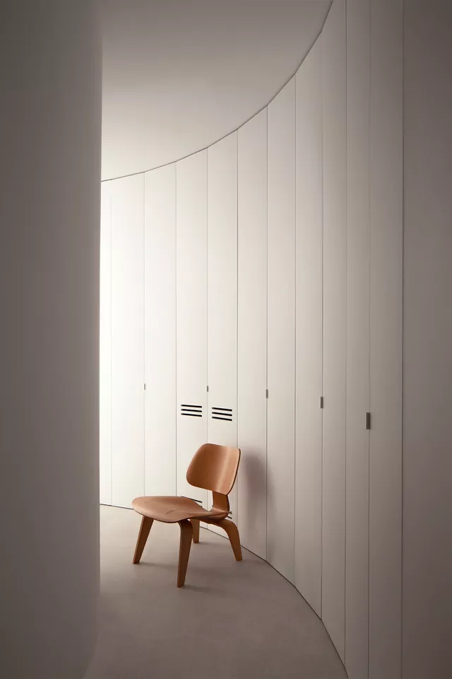 The introduction of curved geometry in the dividing elements helps break the perspective in transit areas, which are sufficiently ample and capacious to become useful spaces where even small domestic lounge corners can be set.