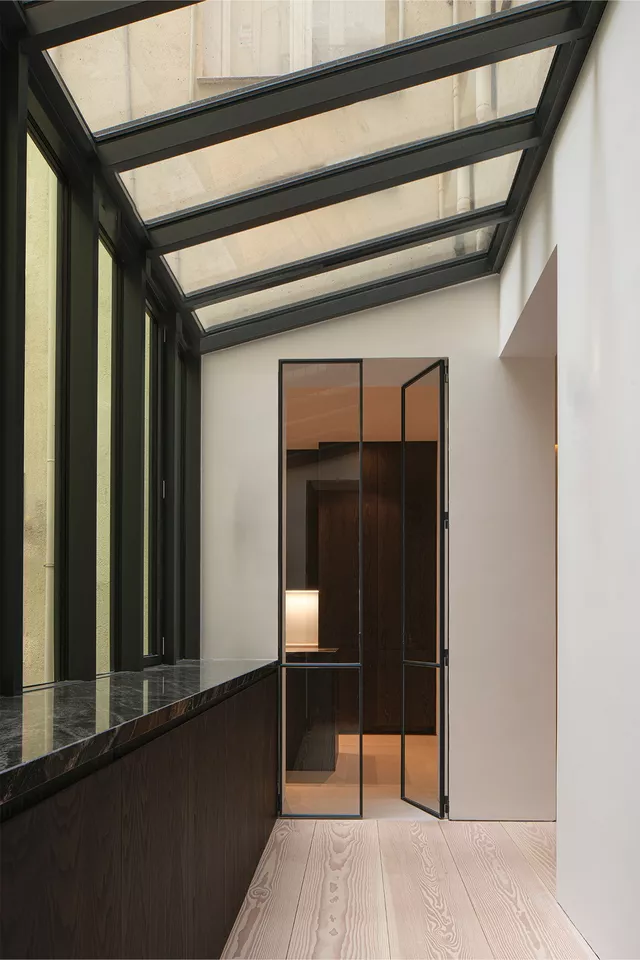 La incorporación de suelos hechos a medida de grandes tablones macizos de abeto gran Douglas, así como de elementos contemporáneos diseñados y fabricados artesanalmente a medida, crean un delicado ambiente atemporal donde lo clásico y lo contemporáneo conviven en armonía.