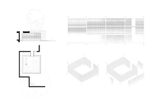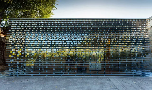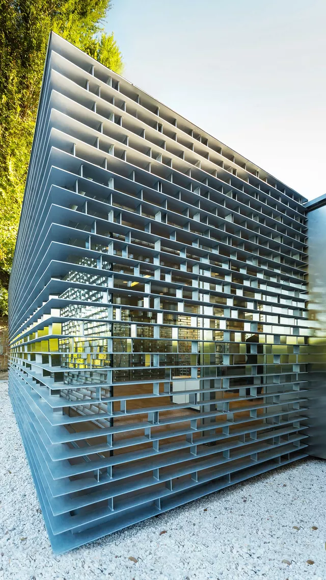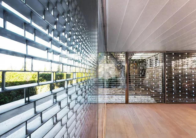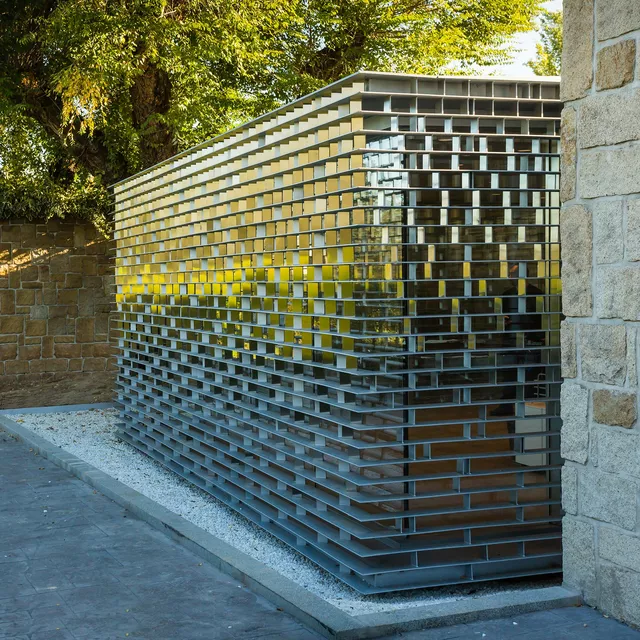 El patrón resultante ayuda a integrar la nueva edificación con el edificio existente gracias al patrón que forman las lamas de acero manifestándose como un negativo de las llagas de cemento que conforman el muro de mampostería de piedra del edificio existente. Las materialidades de acero reflectante de la celosía y la segunda piel de vidrio ayudan a mimetizar el edificio con el entorno natural existente mediante sus propias cualidades de reflejo y transparencia.