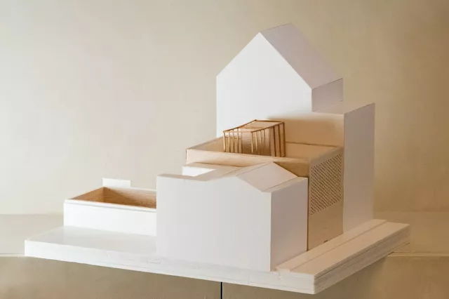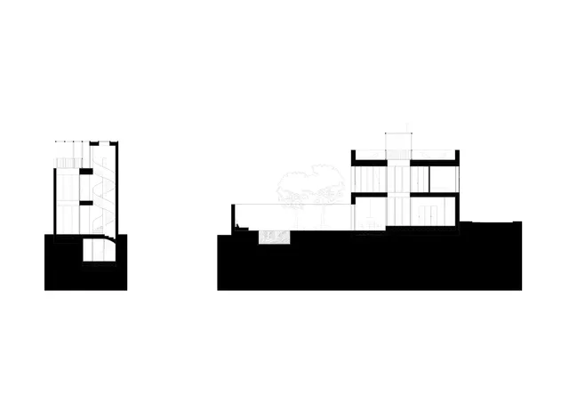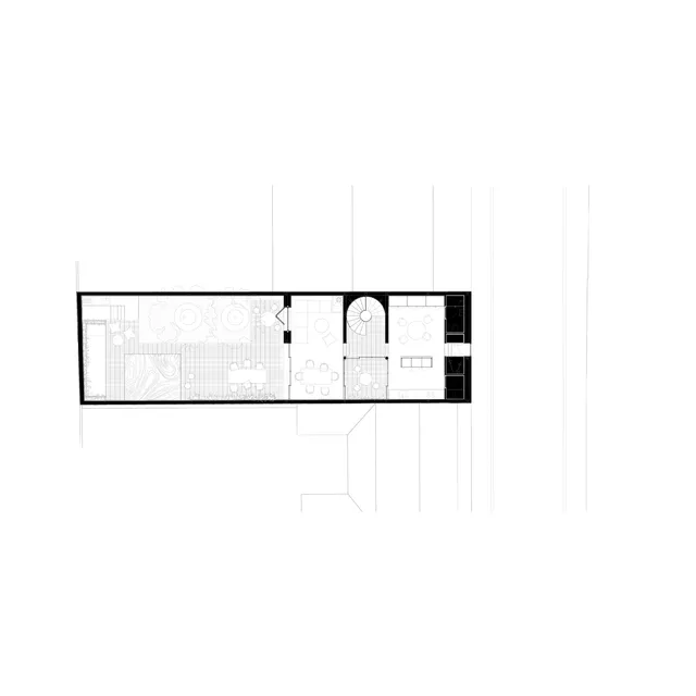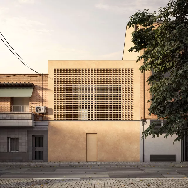 Su implantación y volumetría responden a una intervención respetuosa con el barrio. Mediante su fachada a la vía pública la vivienda se muestra como un telón abstracto que dialoga con el entorno mediante su materialidad, funcionando como transición entre los edificios de múltiple escala construidas en la misma calle y garantizando la privacidad de los ocupantes al no revelar su interior.