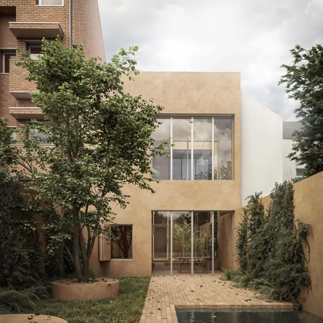 En la parte posterior de la parcela, un amplio espacio exterior con abundante vegetación crea un oasis urbano. Este espacio no solo ofrece un refugio de silencio y frescor, sino que también extiende la vida interior de la vivienda hacia el exterior.