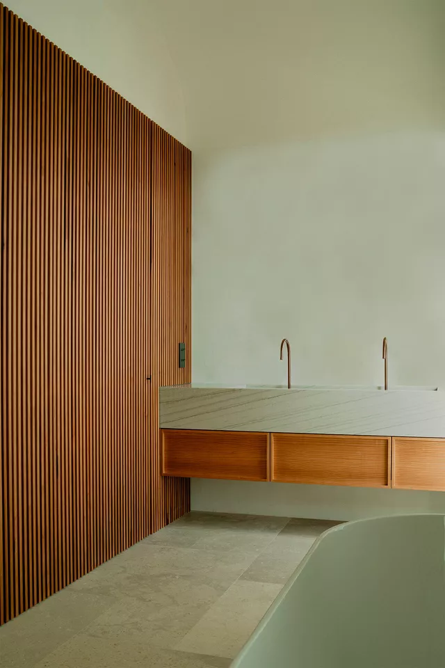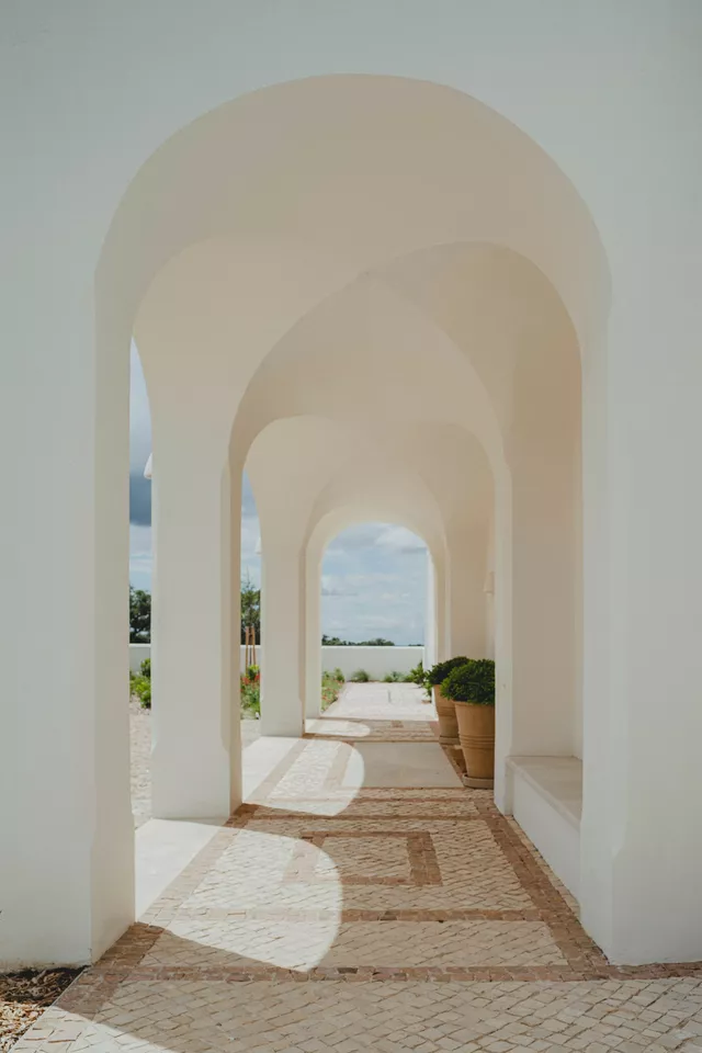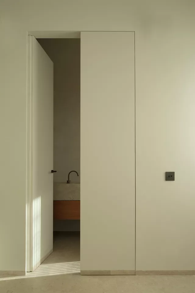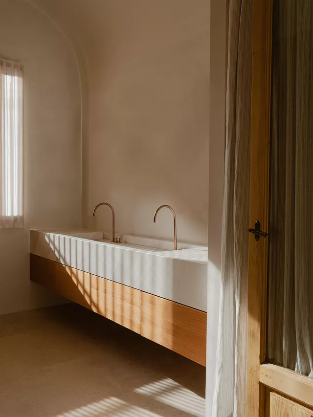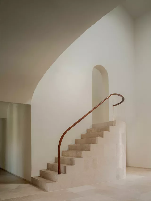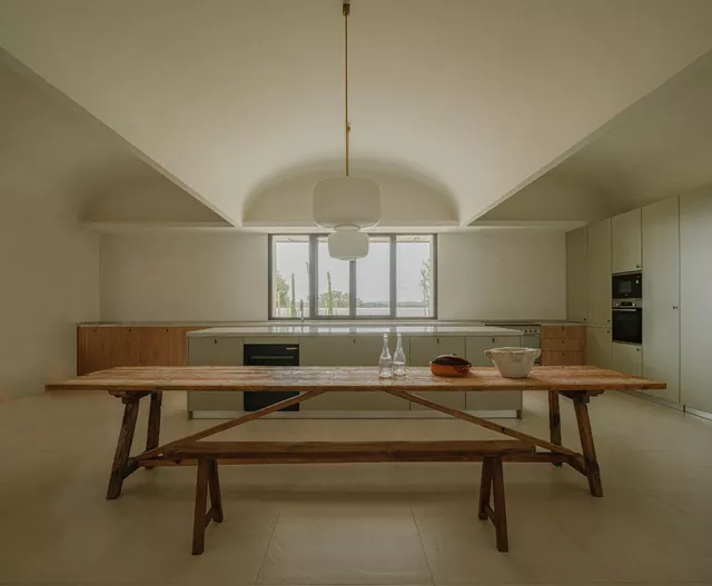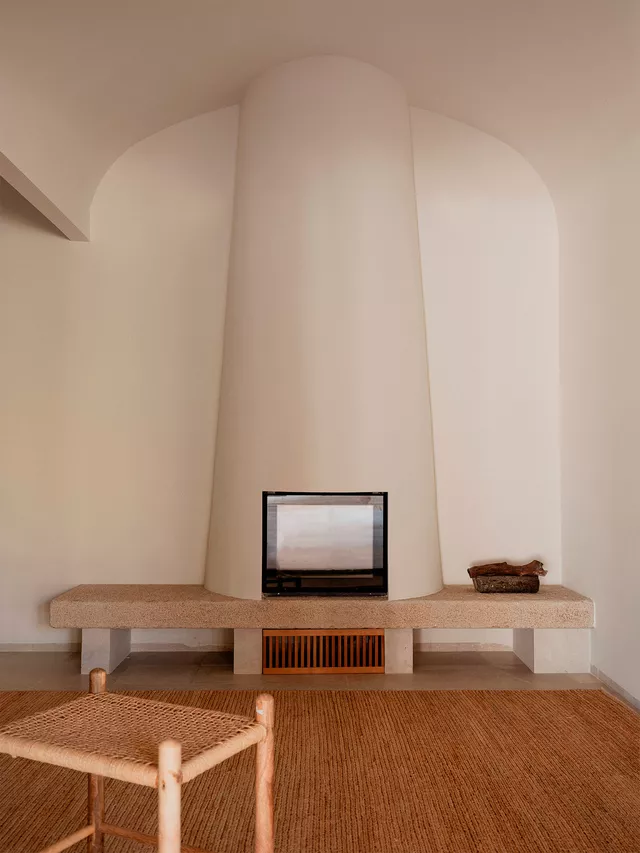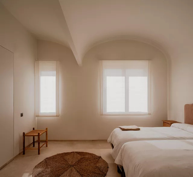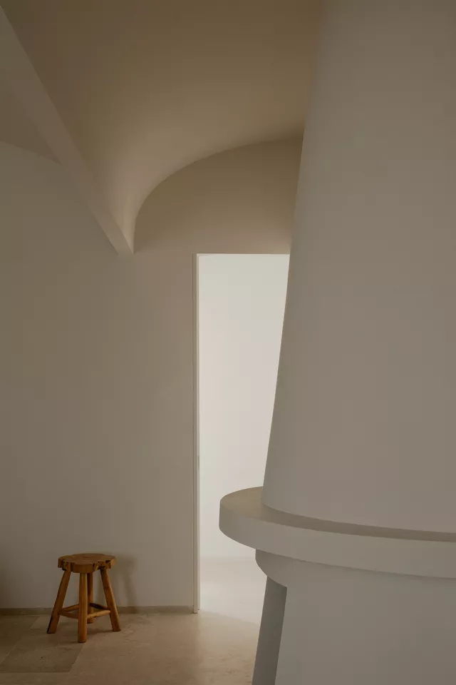 El interior se caracteriza por su pureza espacial, geometría clara y cuidado diseño que combina el uso de texturas naturales y materiales locales. El ritmo ordenado y pausado de los huecos en fachada junto con la seriación de bóvedas componen una casa que equilibra de manera perfecta su origen tradicional con los valores contemporáneos de la arquitectura.