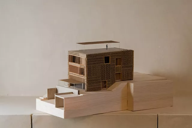 Vivienda unifamiliar en el límite entre el Parque de la Dehesa de la Villa y el barrio Bellas Vistas del distrito de Tetuán de Madrid. El proyecto surge de la necesidad de albergar un programa de vivienda completo y otro vinculado a la actividad profesional. Se proyecta un volumen limpio que aprovecha el fuerte desnivel de las dos calles que limitan la parcela, generando dos accesos diferenciados, abriéndose tanto a las vistas hacia el parque y la Sierra Norte de Madrid como a las despejadas vistas al horizonte de la ciudad en su extremo opuesto.