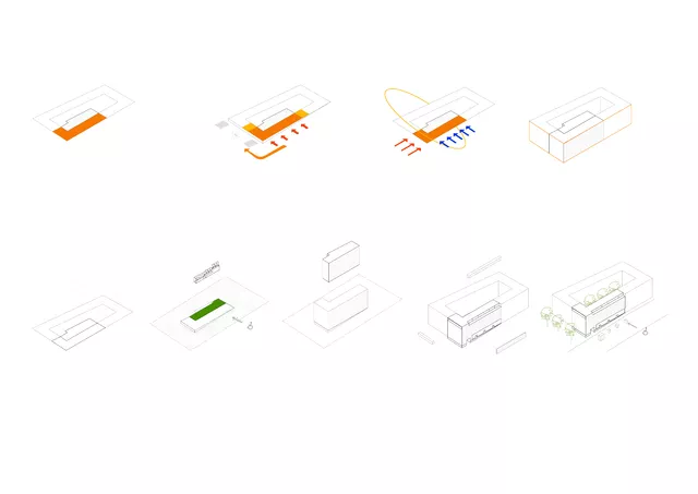 Así, la propuesta desarrolla un elemento que trata de recordar la memoria del lugar evocando las antiguas construcciones con usos mayoritariamente terciarios que existieron anteriormente en el solar, cuya contundencia formal y constructiva resuelve el programa inmobiliario planteado en un solo gesto, desde la racionalidad y economía, no desde las singularidades concretas, sino con la capacidad del objeto de resolverlas todas con un solo mecanismo. Desarrollando los siguientes conceptos: