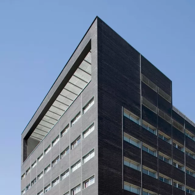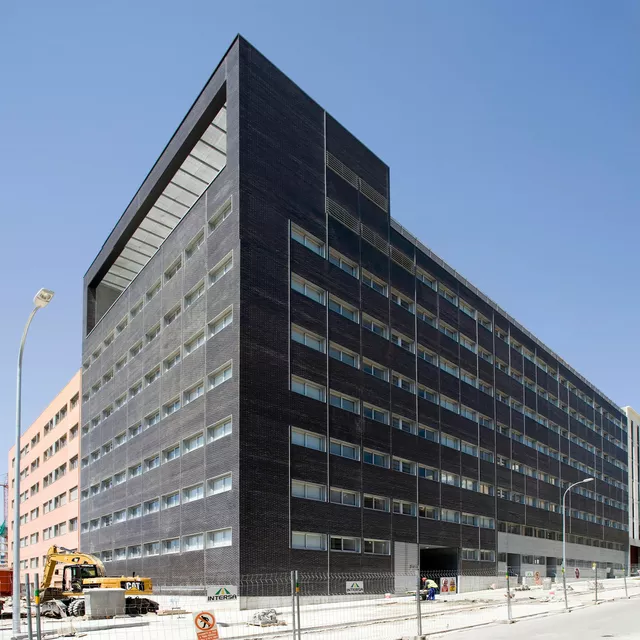- Intentar dar una respuesta sensible a la memoria del lugar a través de la materialidad del proyecto, mediante la cual el edificio intenta difuminar su presencia como masa construida. Para ello recurrimos al concepto de piel, una piel de ladrillo clinker vidriado, complementada mediante unas placas de acero contrapeadas que forman las juntas de dilatación de la fachada.