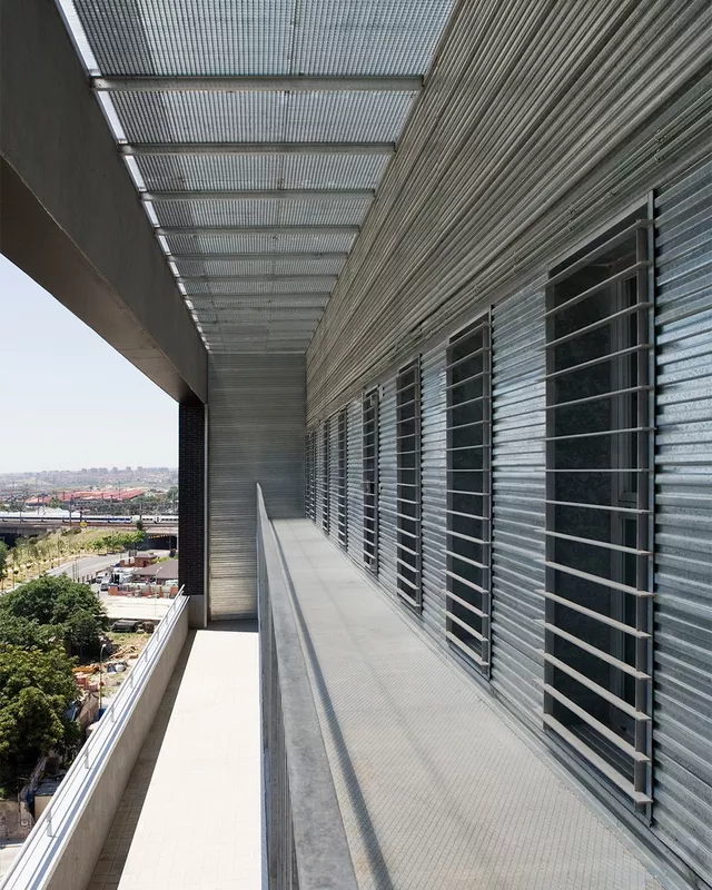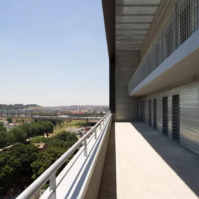 - Rematar el edificio con un gran balcón en su parte superior que mediante su gran escala relaciona el edificio con la silueta de Madrid, el barrio de Villa de Vallecas y la M-30, integrándolo en el horizonte quebrado de la ciudad.