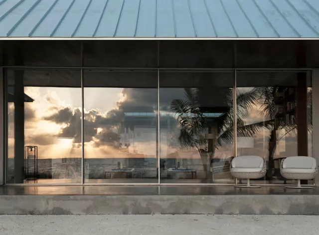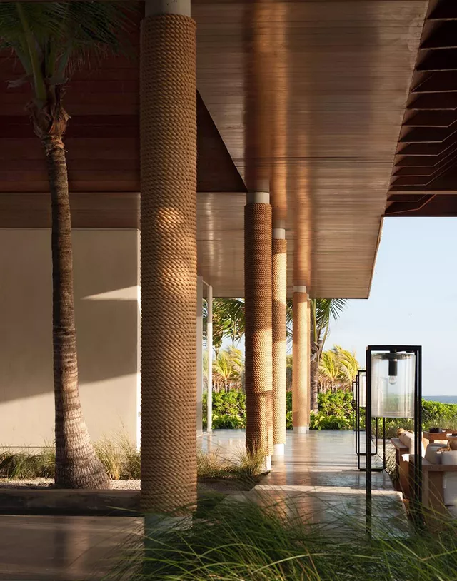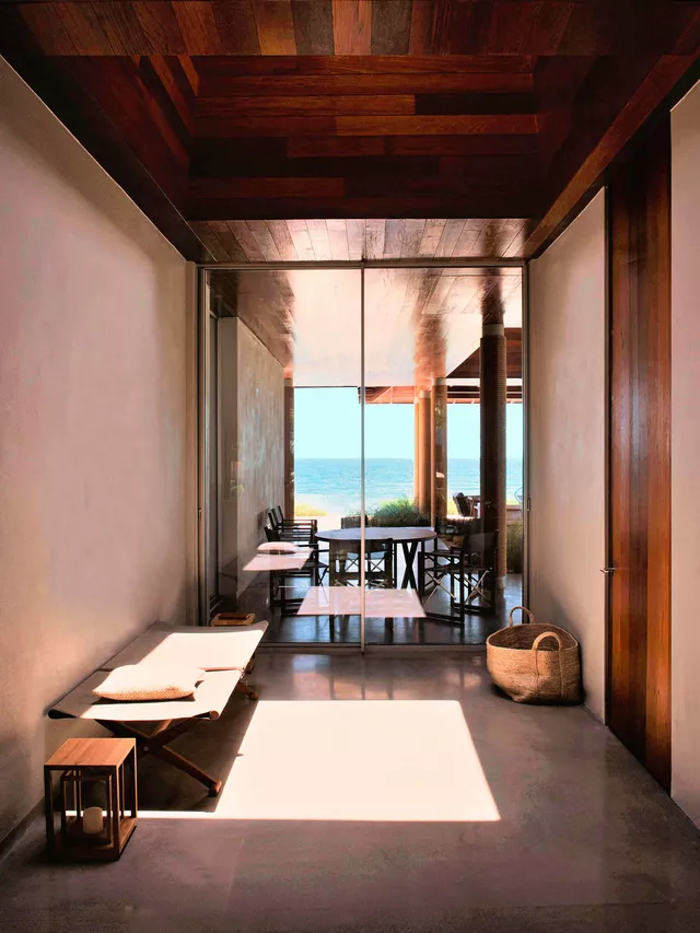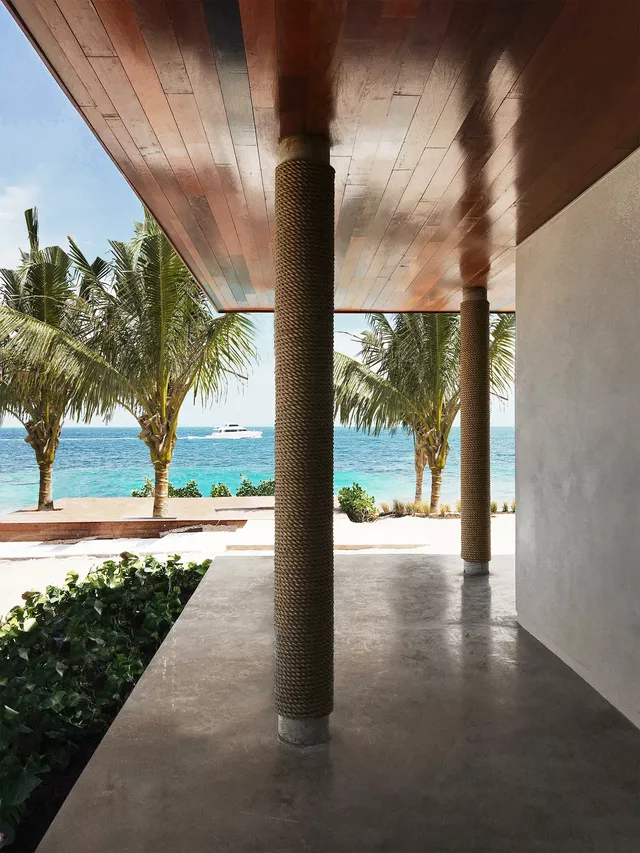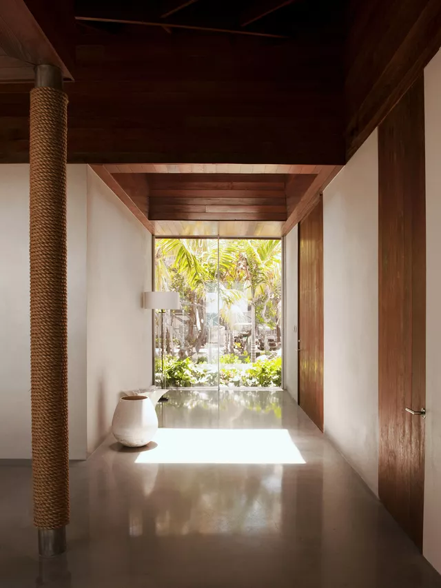 La atmósfera interior trata de reproducir con sencillez los materiales empleados en el exterior, la madera tropical de la cubierta se reutiliza en las puertas y los elementos interiores de mobiliario, el suelo es una plataforma continua de hormigón, la rugosidad de las paredes exteriores se mete hacia el interior, los pilares circulares de hormigón se revisten mediante soga de yute natural local, tratando de mimetizarse con las palmeras existentes,… Todo ello, con el sencillo objetivo de disfrutar de vivir en un espacio bajo la sombra, frente al océano, rodeado de palmeras y naturaleza.