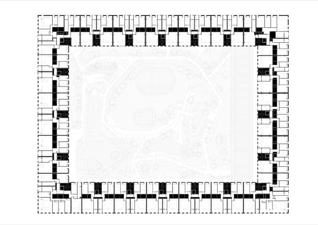 El objetivo es crear un paisaje interior que recuerde al campo manchego. Sus plantaciones recrean un microclima que filtra las altas temperaturas estivales mediante la refrigeración por evaporación y, con el uso sensato de la xerojardinería, se consigue reducir la demanda de agua para los espacios comunes. Se estudia el impacto de los vientos dominantes, de modo que el volumen se moldea para evitarlos o favorecer su paso a través del edificio. Se ha previsto una zona específica para el cultivo de esparto con el fin de proporcionar a la Comunidad la materia prima para la fabricación y posterior reparación de las persianas naturales de protección solar. Con ello, la Arquitectura recupera estas persianas tradicionales, especialmente adecuadas para este tipo de clima, ya que proporcionan sombra al tiempo que permiten el paso del aire.