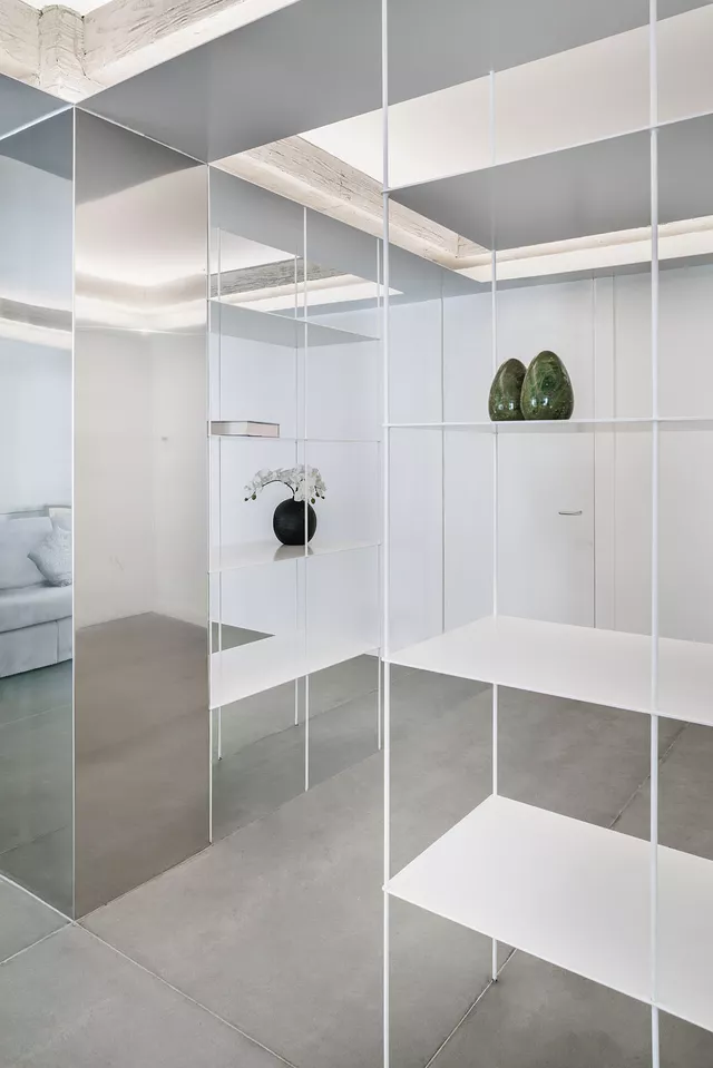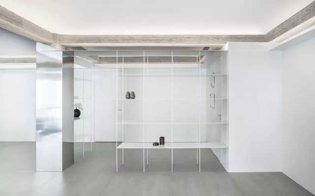 The texture of the mass concrete of the original structure is balanced by the use of sophisticated, light, polished elements in burnished stainless steel sheet. These light elements cover the columns to make them disappear and achieve carefully considered ambient lighting of the space using fine suspended strips in the same material. The careful design of light, delicate lacquered steel shelving, acting as a small filter at the entrance, completes the intervention.