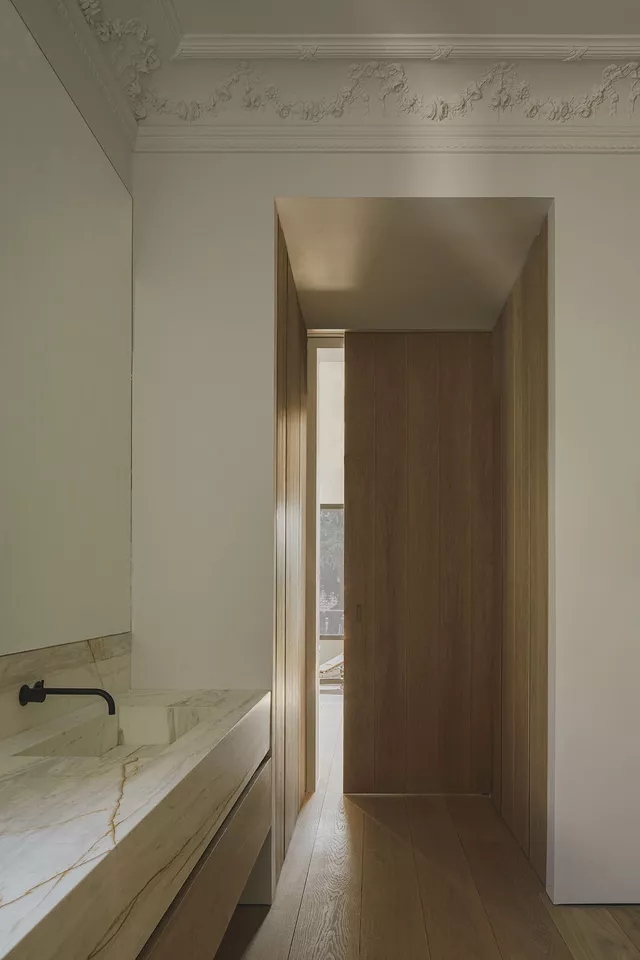 Once this historic character was reinstated, the interior was balanced with custom contemporary details using noble materials like solid wood, marble, and stainless steel.